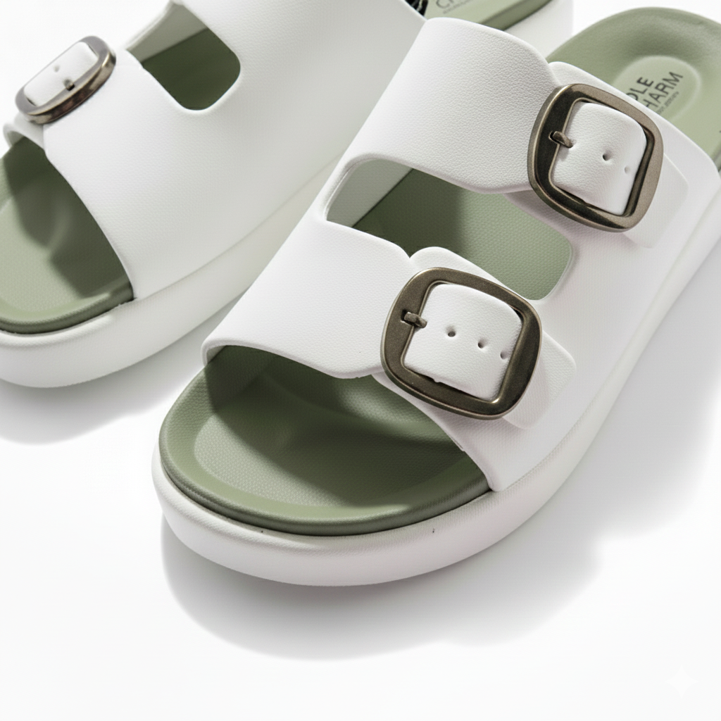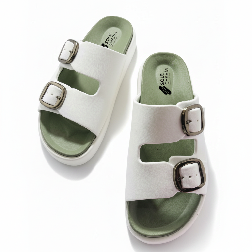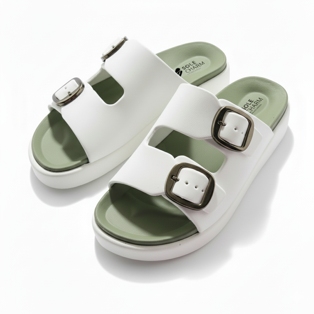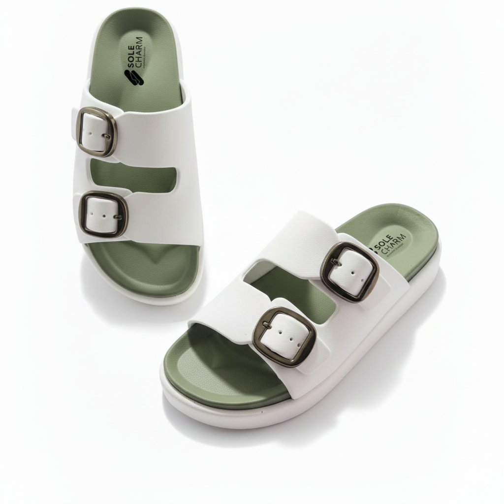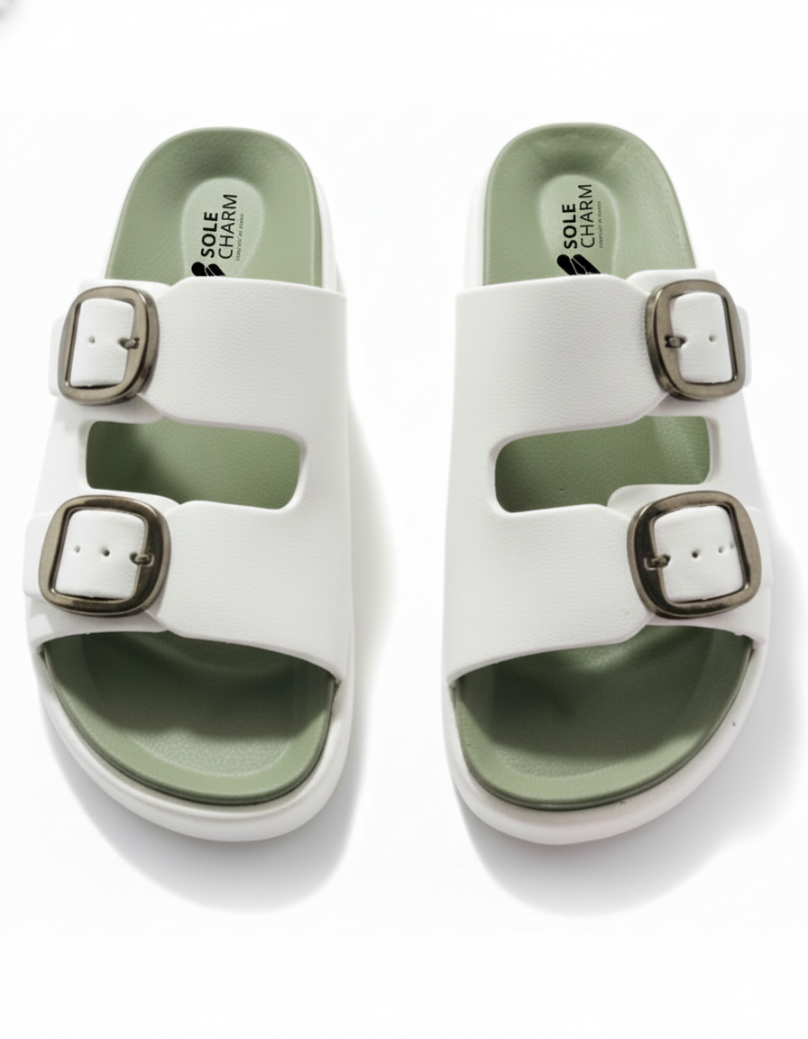 Step out in comfort and style with the chic Sole Charm Double Buckle Slides!